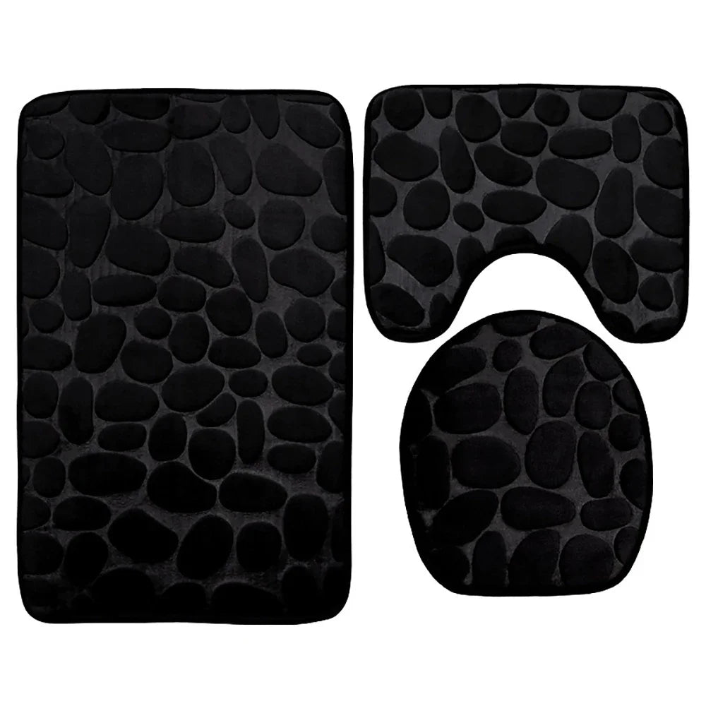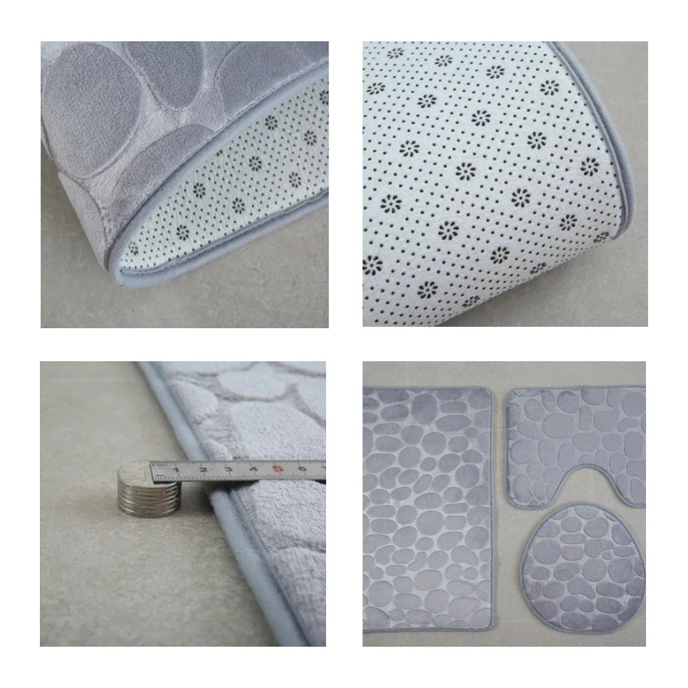 The CobblestoneComfort set of 3 non-slip, absorbent shower rugs brings luxury and functionality to your bathroom. This set includes two soft, non-slip rugs and a toilet lid cover, perfect for a complete look. The pebbled effect not only offers aesthetic appeal but also provides a comfortable and soft surface for your feet. Thanks to the absorbent materials, your floors stay dry and safe, while the non-slip backing provides stability, even in wet conditions. Upgrade your bathroom decor with these versatile and stylish rugs!