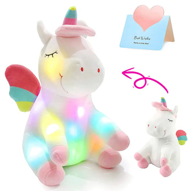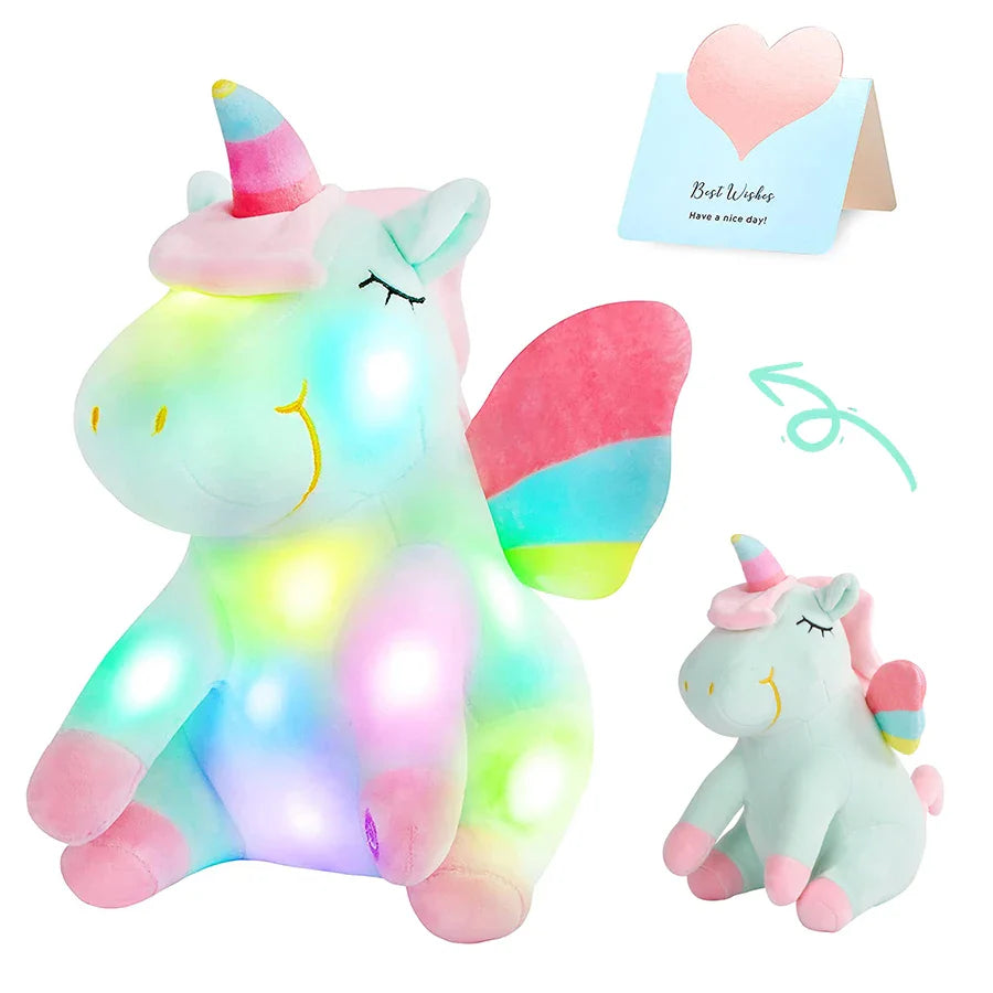 Bring their imaginations to life and fill their nights with magical enchantment with the Light Up Unicorn Plush Toy! This adorable plush friend isn't just soft and cuddly—it comes to life with soft, glowing lights and soothing music, creating a calming and enchanting bedtime experience for little ones. Available in adorable green and pink colors, this adorable unicorn is sure to be a favorite with girls of all ages.