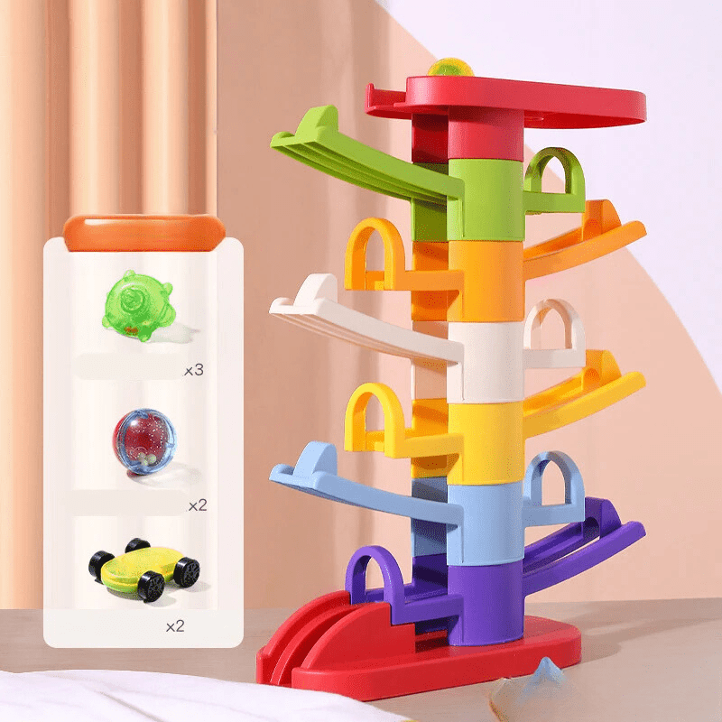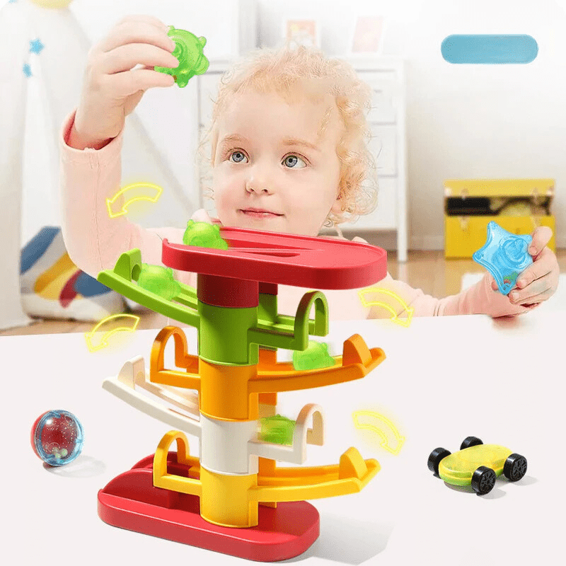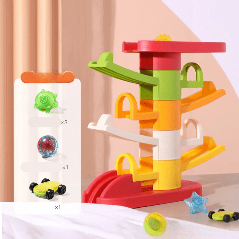 The InertiaFun car and ball stacking toy is an innovative Montessori toy that helps children develop important skills. Featuring a slide for cars and a ball, this toy promotes creative play and motor development. Perfect for children aged 3 and up, this educational tower provides endless playtime fun while also teaching children about gravity and color.