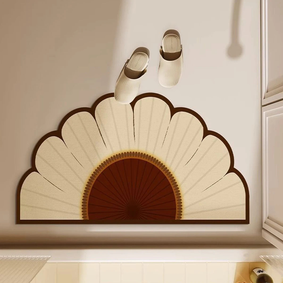 Add a touch of freshness and functionality to your interior with the DaisyGrip . This stylish doormat with a daisy design is perfect for the bathroom, toilet, or entrance. Its semi-circular shape and non-slip material provide safety and comfort, while the diatomaceous mud offers excellent water absorption and dries quickly to keep your floors clean and dry.